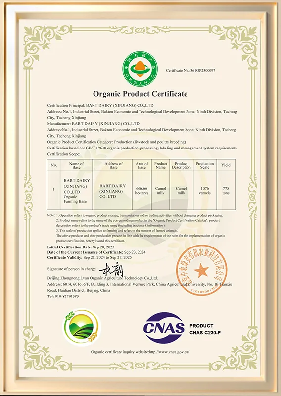 The camel milk is carefully selected from free - ranging Bactrian camels in the Ta'e Basin of Xinjiang. Located in the golden milk source belt at 47° north latitude, this area is rich in grass and shrub vegetation such as Haloxylon ammodendron and Apocynum venetum, providing organic nutrition for the camels.